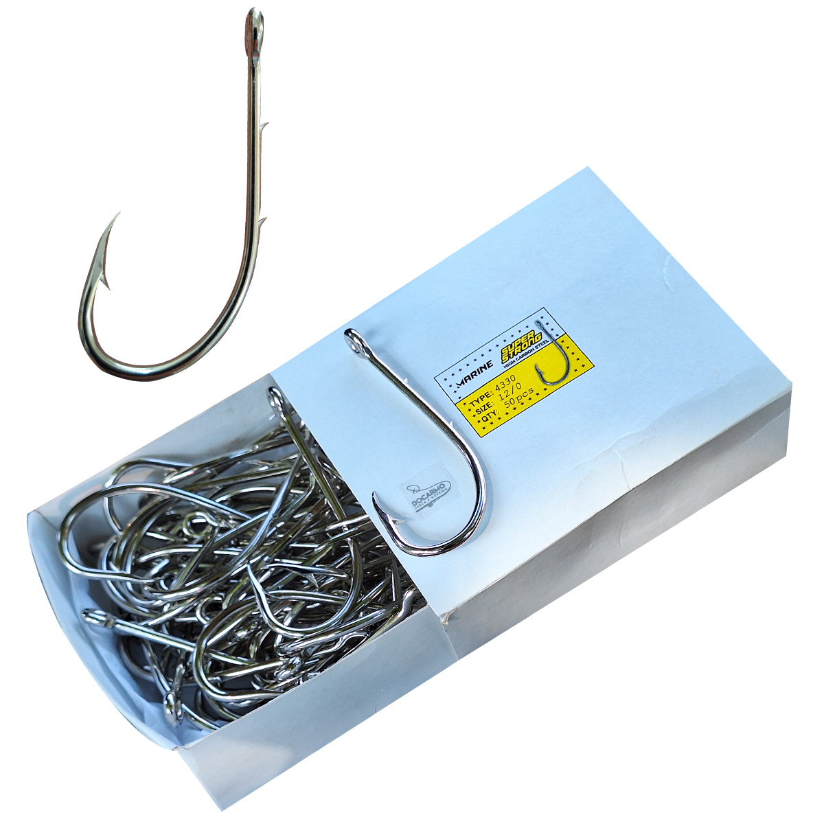 Anzol Grande com Farpa 4330 Níquel N°12/0 com 50 Anzóis em Aço Carbono o mais resistente da categoria, as pontas afiadas e com farpas fisgas na costa para melhor segurar a isca.