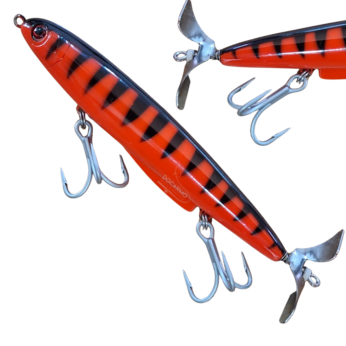 Nunca ocorrerá o desalinhamento da hélice. A hélice de aço produz um ruído mais estridente. Nunca ocorrerá o desgaste no pistão. A barriga da ROCKET é mais achatada e possui uma aleta (quilha), evitando o giro da isca até mesmo nas puxadas mais fortes. Munida de garateia 4 X nº