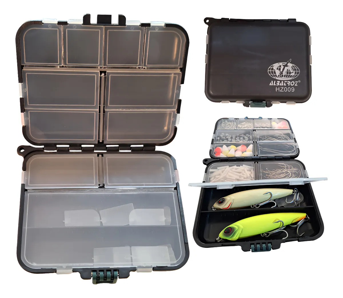 Oestojo tem duas faces com 12 compartimenstos fixos e mais 8 divisórios ajustáveis totalizando 20 compartimentos no máximo, se fecha ao meio para não correr risco de abrir e perder os acessórios durante a spescari, o modelo é ideal para manter organização dos seus equipamentos de pesca.